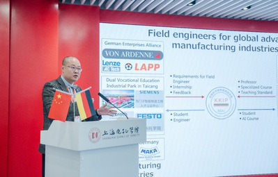 凯劳智能制造学院院长蔡骋介绍了凯劳学院自2016年成立以来依托中德合作办学平台,在人才培养、师资建设、产教融合、文化交流等方面取得的阶段性成果。